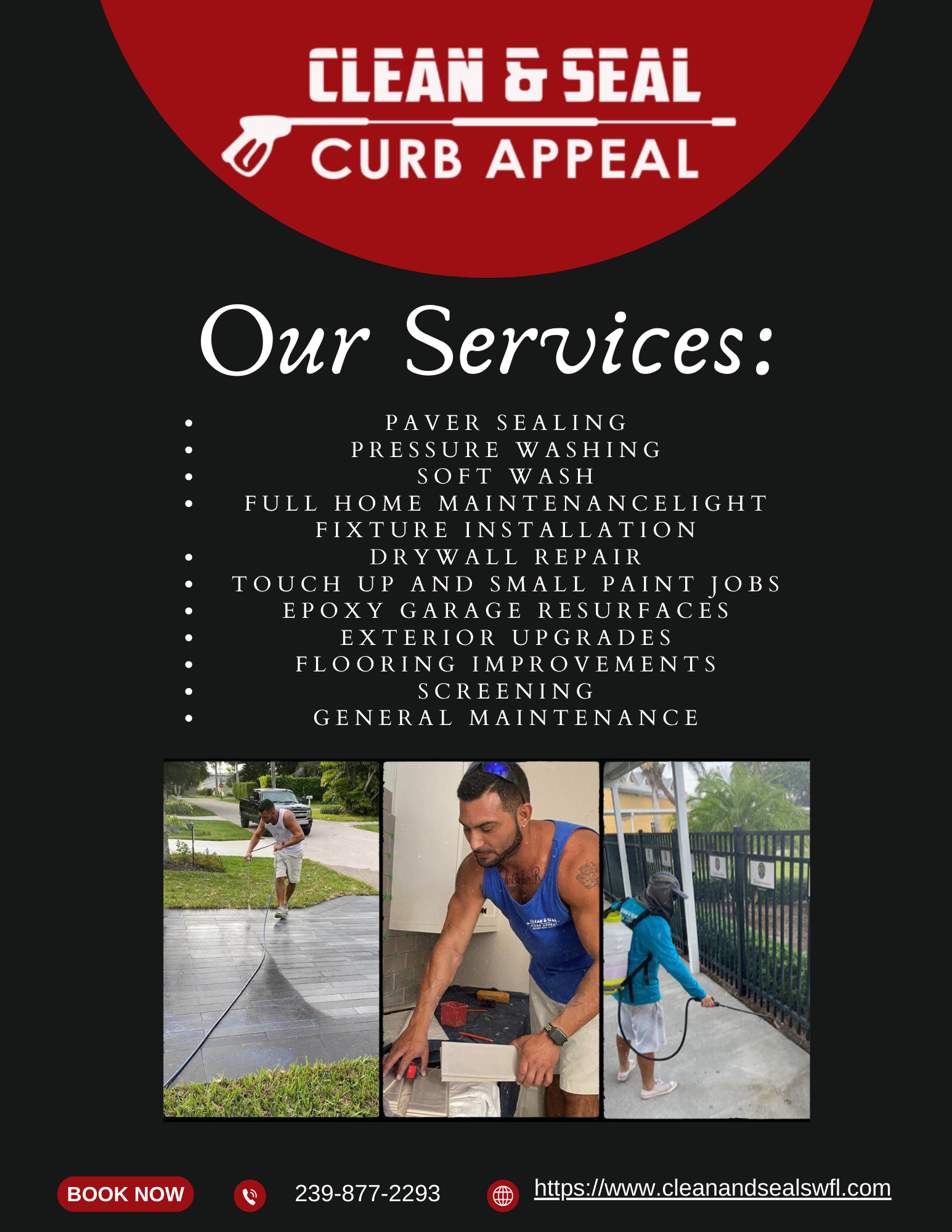 To complete your home’s aesthetic and functional needs, Clean and Seal Curb Appeal delivers reliable services such as landscaping, home maintenance, and handyman assistance. Whether it’s nurturing greenery or repairing household fixtures, every detail is handled efficiently. From installing new flooring through our skilled flooring contractors to maintaining stunning outdoor surfaces, every service is designed to keep Estero homes looking their best. Give us a call today!